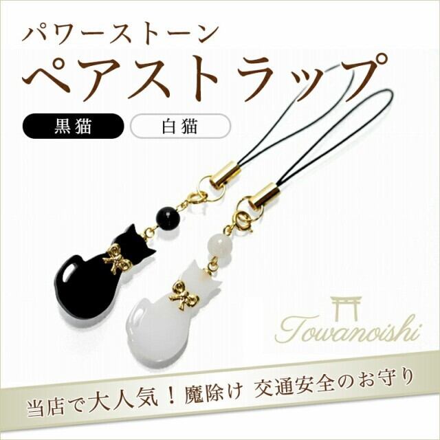 黒猫 白猫 厄除け 交通安全のお守り ストラップ パワーストーン 猫ストラップ モリオン 黒水晶 ミルキークォーツ 福猫 天然石 ペア 携帯ストラップ メール便送料無料 ラッピング無料 誕生日 プレゼント アクセサリー | towanoisi